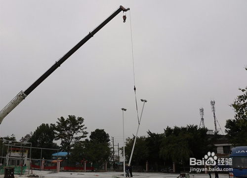 5.立燈桿,可用吊機(jī)或人工將燈桿吊起到預(yù)埋件安裝位置固定